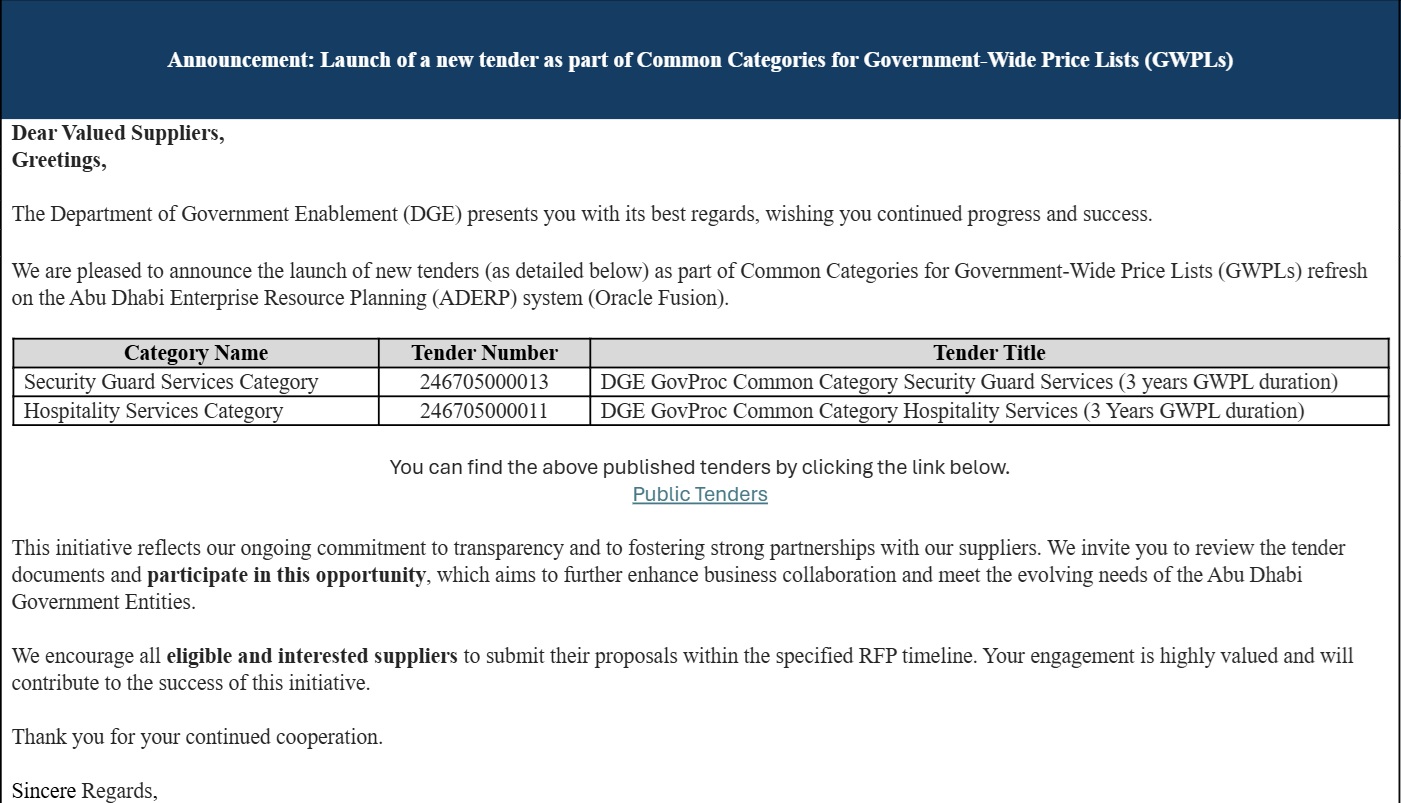 Register and receive an email notification whenever a participating Abu Dhabi Government Entity releases a public tender on Abu Dhabi Government Procurement Gate
